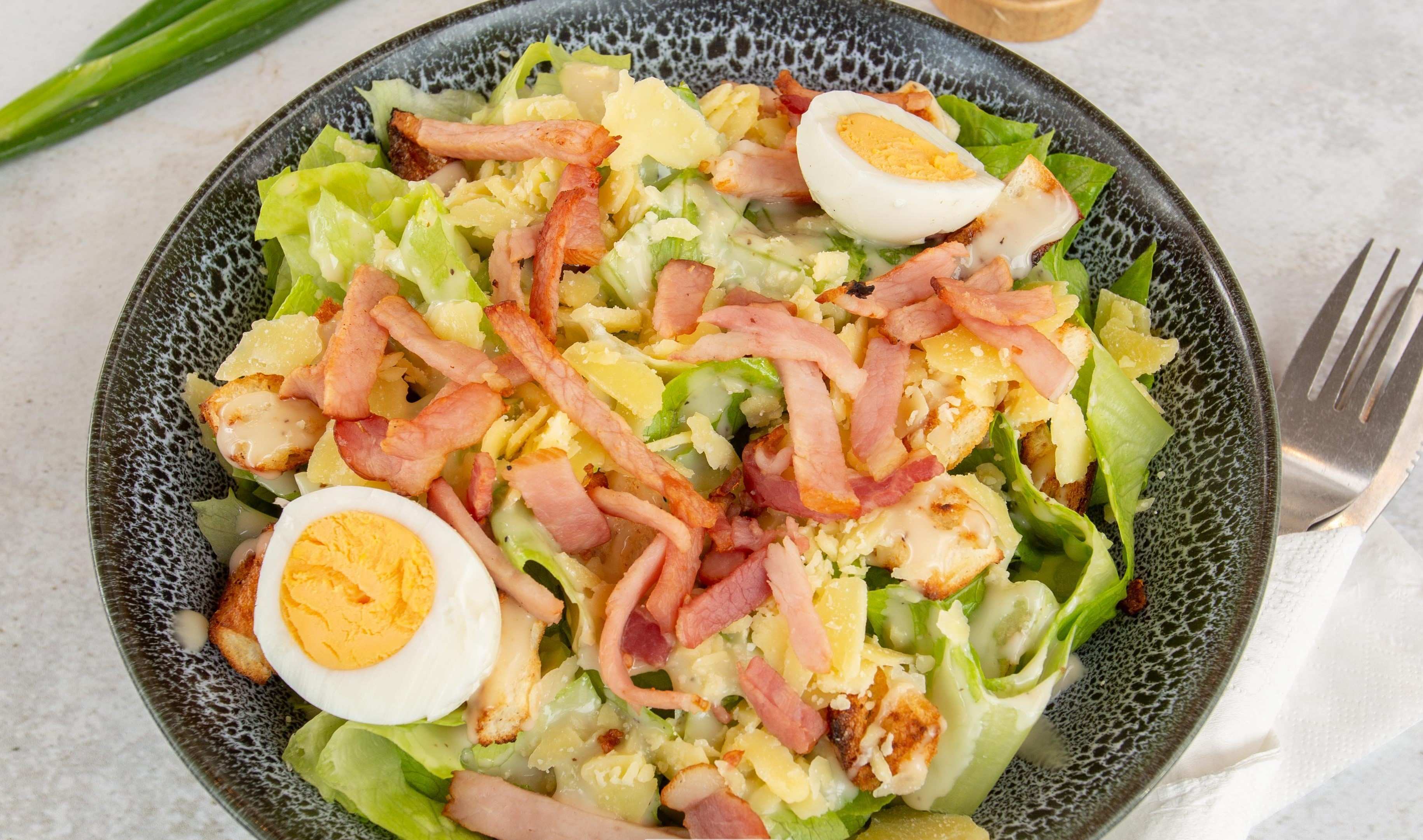 Cos lettuce tossed with croutons, bacon, parmesan topped with a boiled egg and ceasar dressing.0