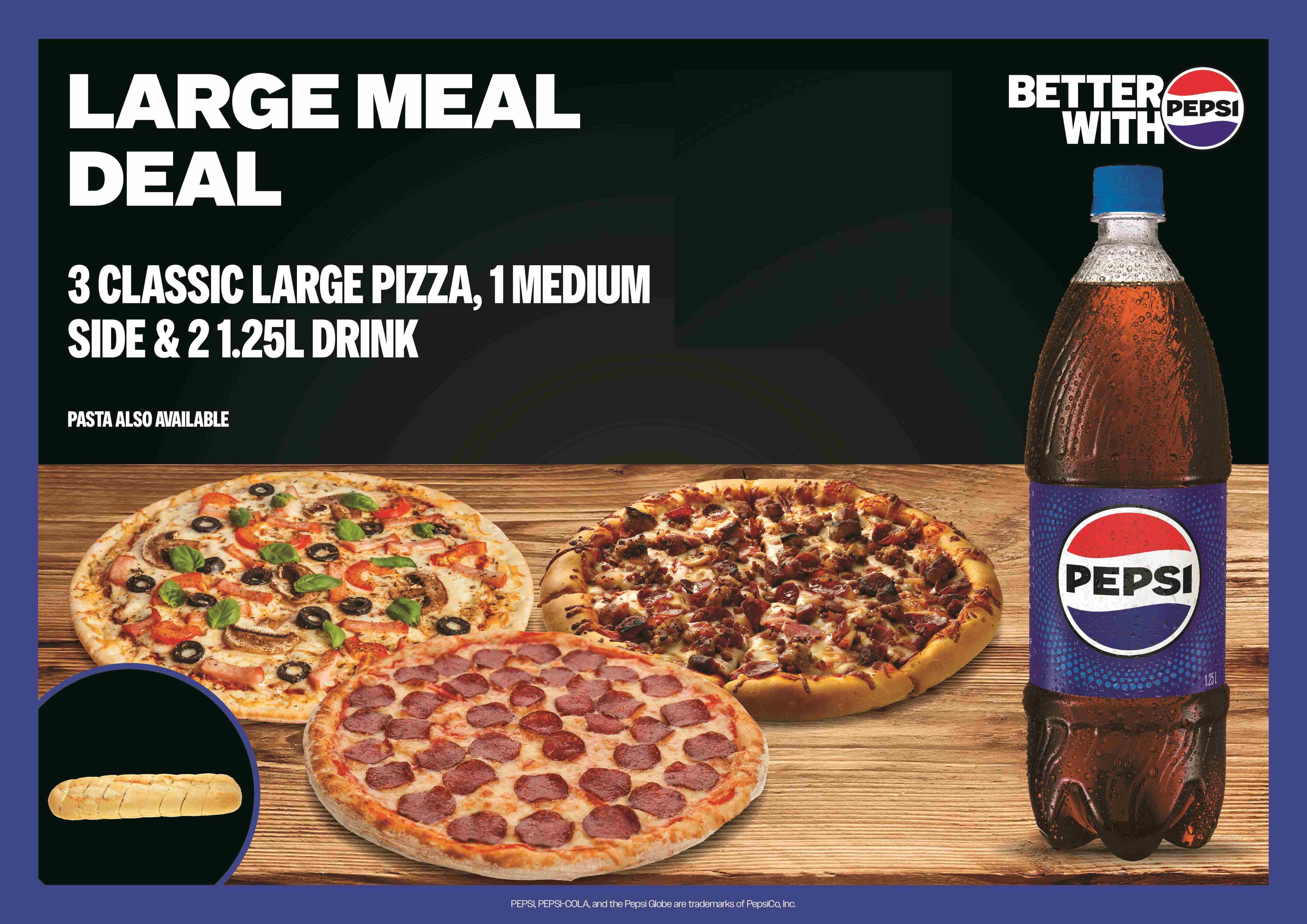Large Meal Deal$75.903x classic pizza or pasta. 1x medium side and 2x 1.25 drink