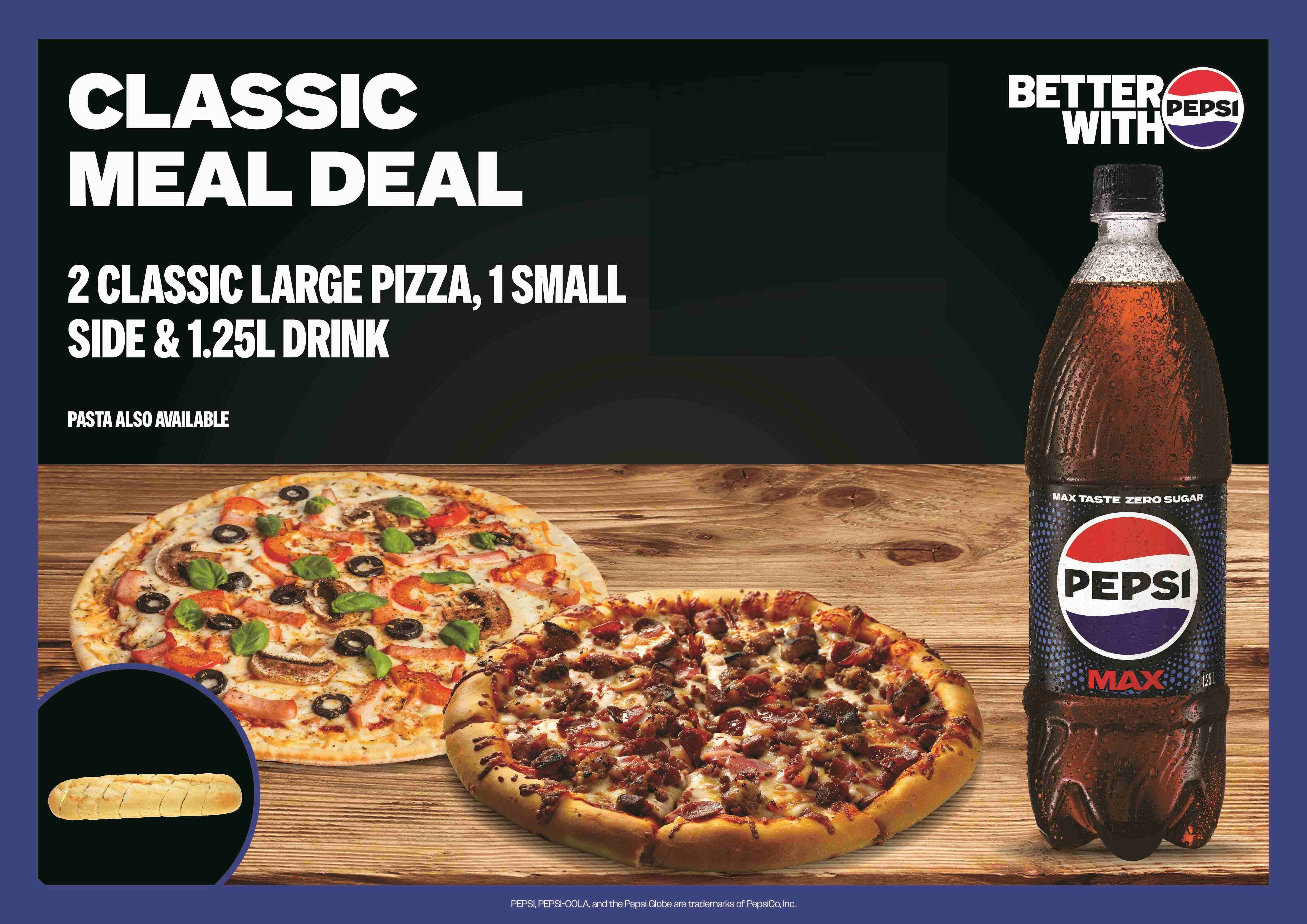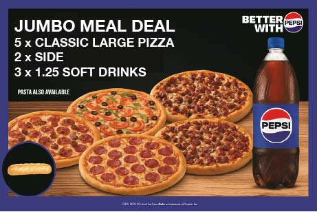 Jumbo Meal Deal$119.905 x CLASSIC LARGE PIZZA OR PASTA 2 x SIDE 3 x 1.25 SOFT DRINKS- Medium Meal Deal$39.902 x MEDIUM PIZZAS 1 x SIDE 1 x 1.25 DRINK