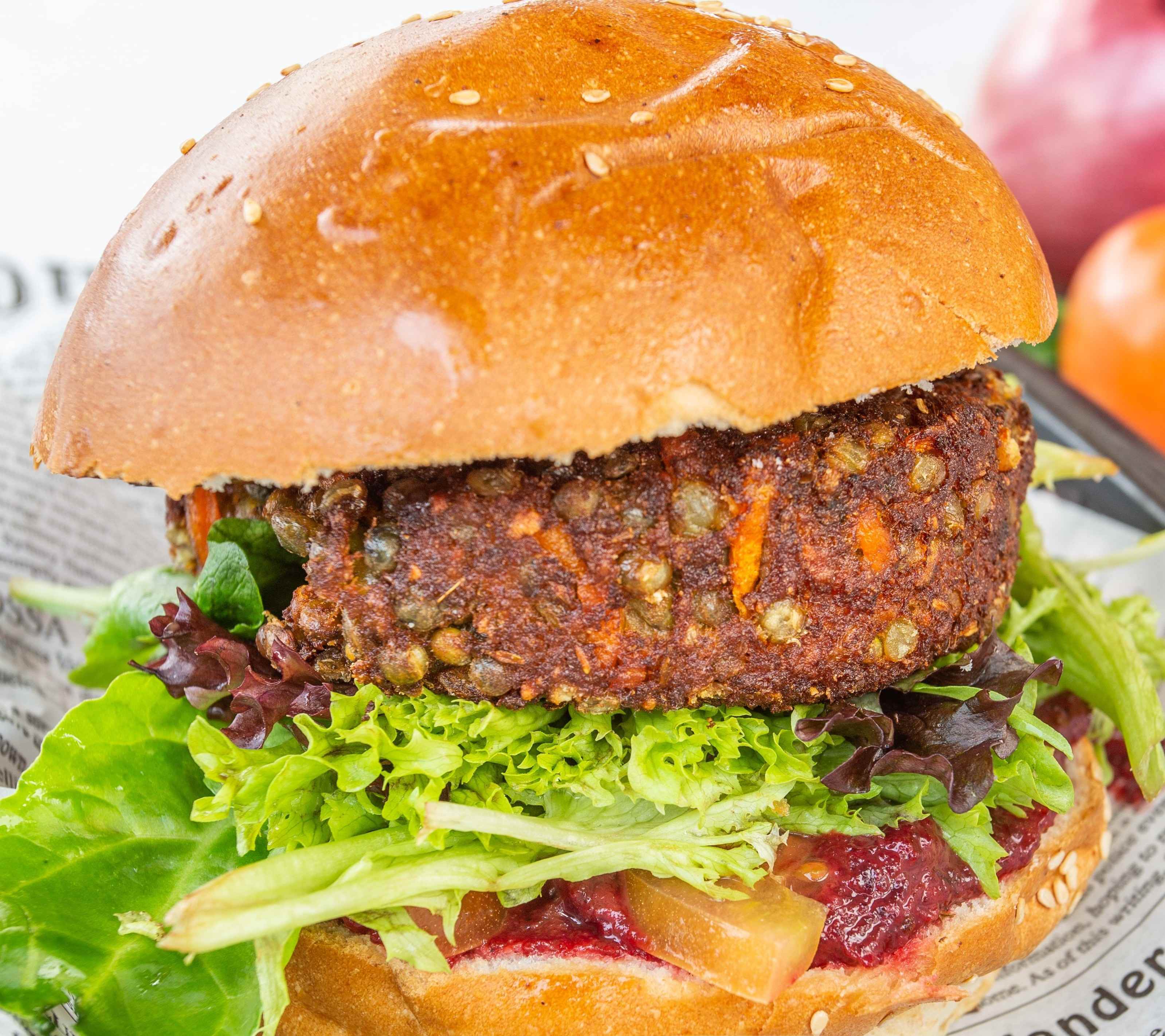 Veggie Patty, Lettuce, Tomato, Caramelized Onions, Beetroot relish, bun0