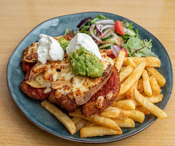 Chicken Breast Schnitzel topped with Sugo, Corn Chips, Sour Cream, Guacamole, Avocado, SalsaExtras